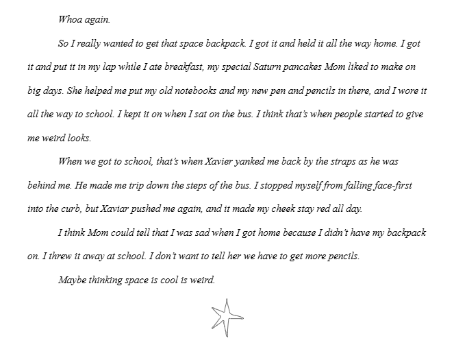 When we were looking at the backpacks together, Mom found the best backpack for me. It was dark blue and had stars all over it. But they didn’t look like the real stars; they looked like how I drew them in my journal with the pointy tips and the squiggly lines. I liked that they didn’t look like real stars. Because it makes me think, if we’re so far away from them, then who knows what they look like? They could be all different shapes, and who are we to talk for the stars? I also learned that we have these devices called telescopes that can help you see things really far away. And Ms. Najma said that the stars we see aren’t actually what they look like when we see them. When we see stars, we’re seeing them in the past because they’re so far away! Like, decades ago. Some even as long as light-years!