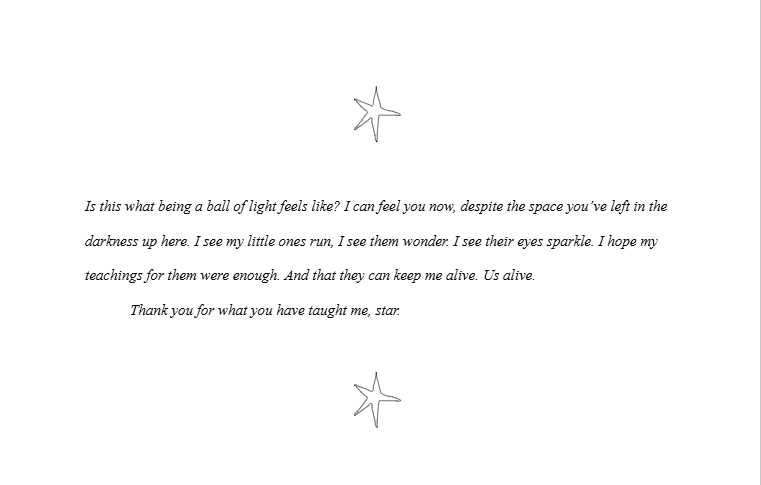I believe you’ll be gone when I leave, I can feel your soul fleeing as my voice is. However, before we leave existence together, let my legacy be taught. Tell the others about who we are and what we are. Not the power that can be harnessed. Not just with a look of ignorance. But a look of hope. And possibility.